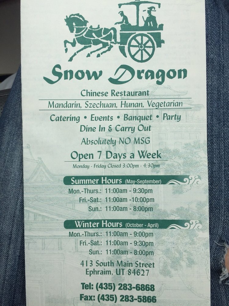 Welcome to Snow Dragon Chinese, a cozy gem located at 413 S Main St, Ephraim, UT. This unclaimed Chinese restaurant beckons with an enticing menu that caters to a variety of tastes, making it ideal for both quick takeout and leisurely dining. With options ranging from flavorful pot stickers to sumptuous egg foo young, each dish is crafted with care, ensuring speedy service without sacrificing quality.
